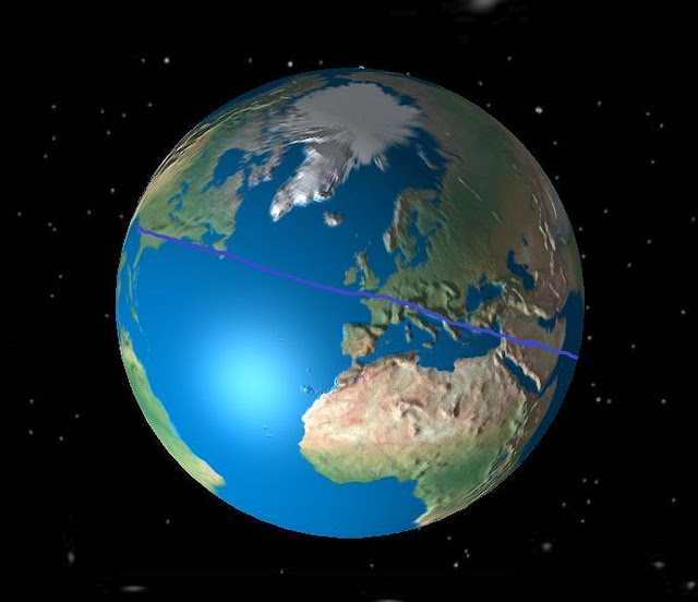 OK, dies ist die Position des Erdäquators vor der letzten Polverschiebung. Wie man sehen kann, war die Position des Äquators ganz anders als jetzt. Das war der Zeitpunkt des späten Atlantis. Während dieser Zeit gab es sehr mächtige Göttinnen-Tempel entlang der Äquatorlinie. Alle diese Tempel waren mit den Mutterschiffen der galaktischen Konföderationen verbunden, die über diesen Tempeln stationiert waren. Diese Mutterschiffe stabilisierten das planetare Netzwerk des Lichts während der Zeit von Atlantis.